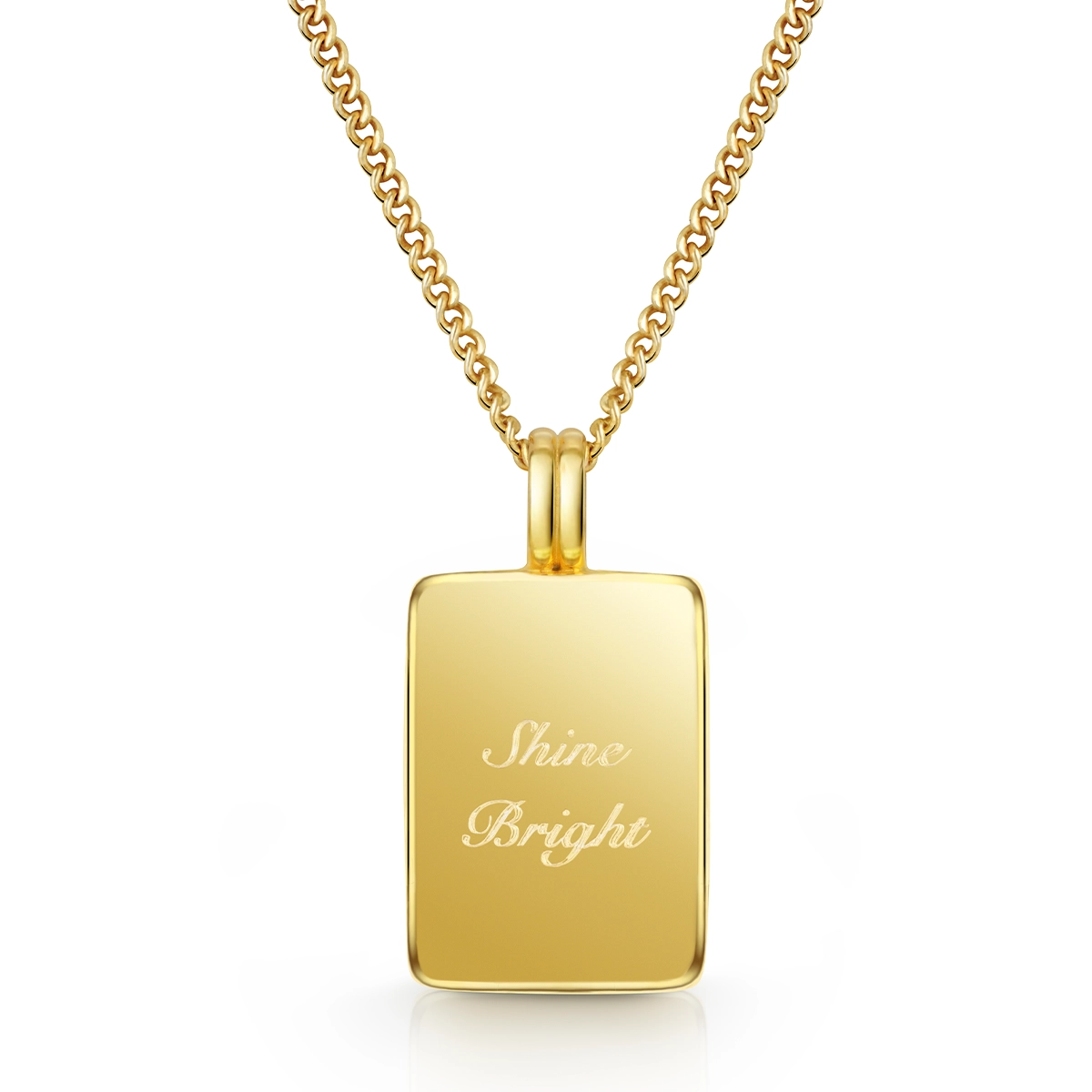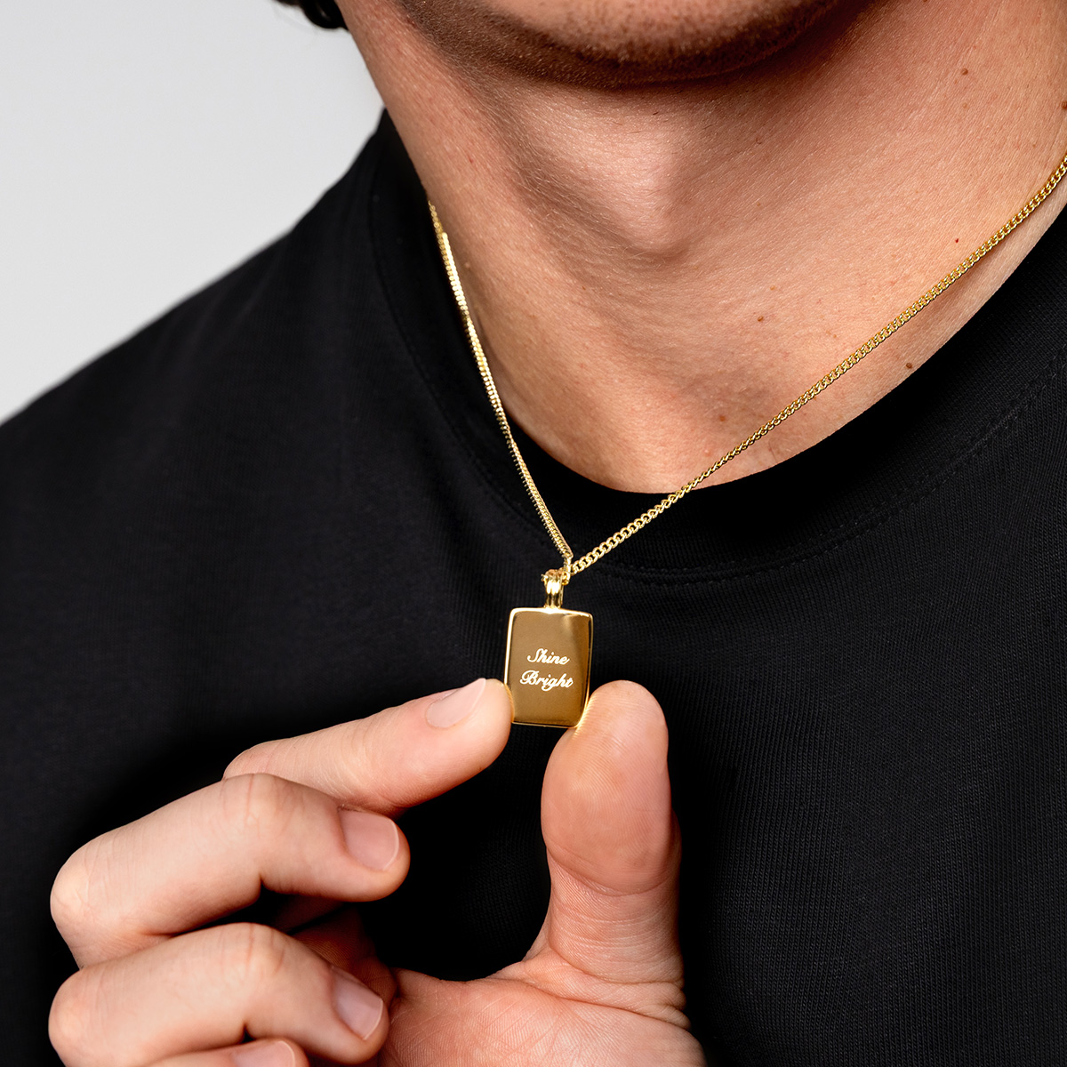 Crafted from 925 sterling silver and plated in 18k gold, the pendant is built for lasting quality while carrying a modern edge. The reverse side offers a smooth surface that can be engraved with a name, initials, or date for a personal touch.