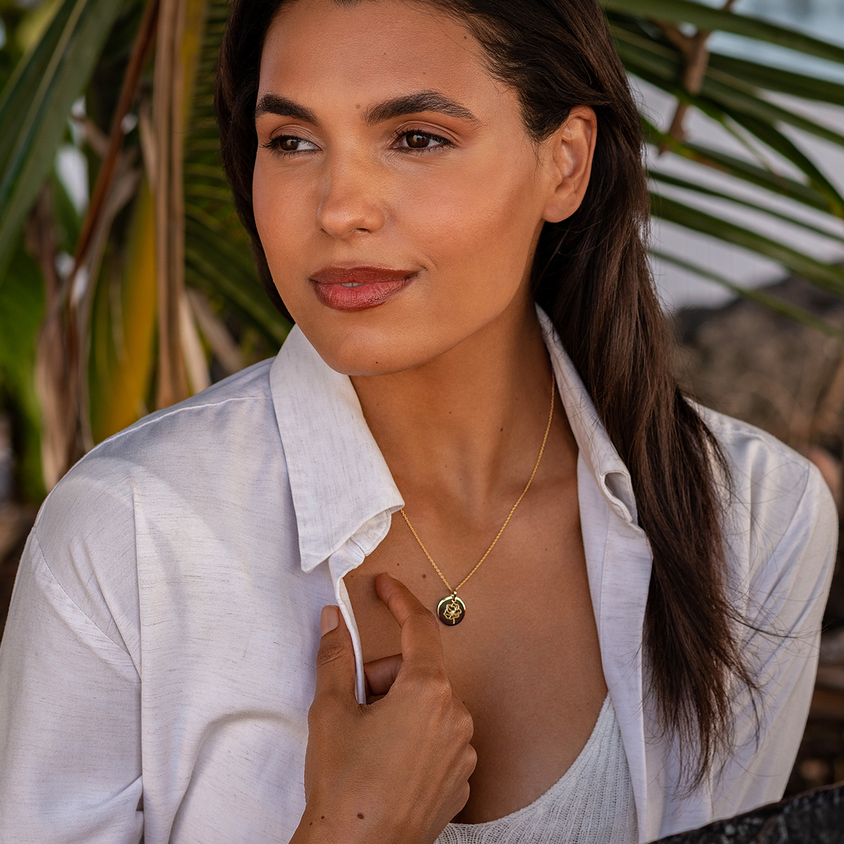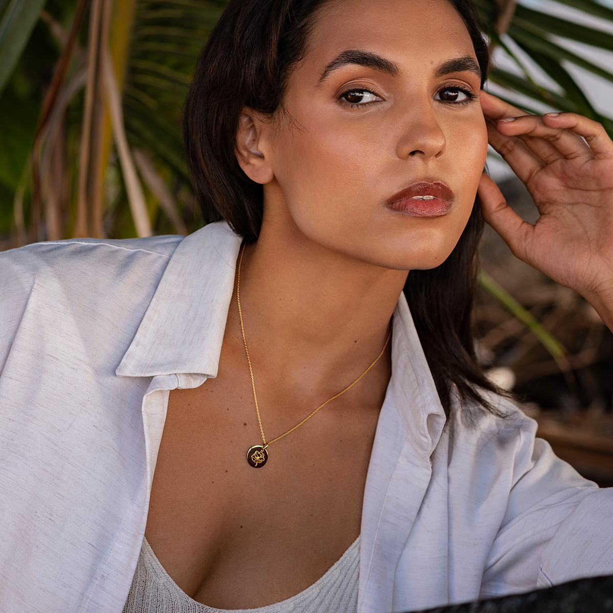 The gold Birth Flower pendant measures 15mm in diameter and tis suspended from an adjustable 16–18 inch trace chain, with the option to upgrade to a longer 20, 22, or 24 inch adjustable chain to suit your style. Each chain is crafted from sterling silver and plated with 18k gold.
