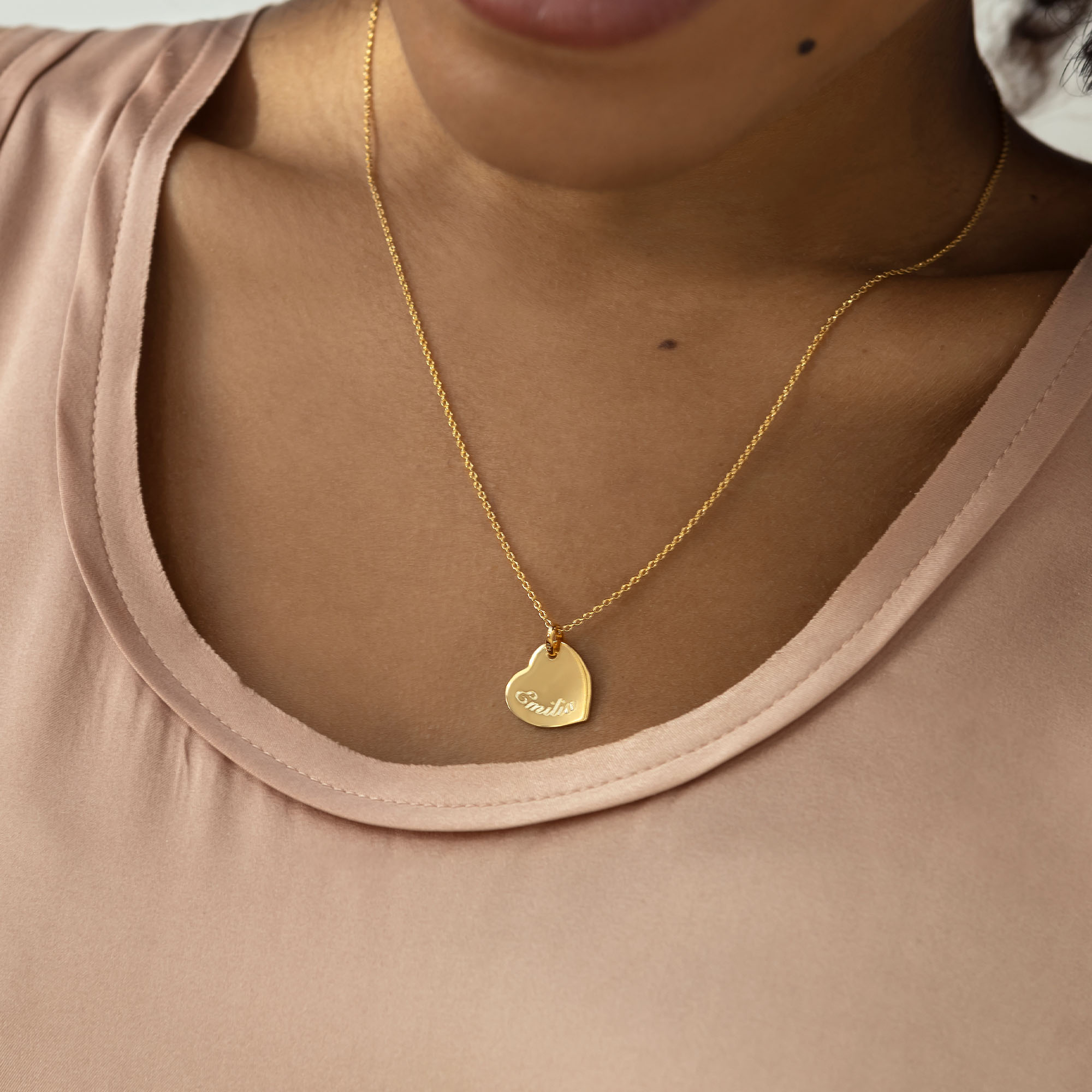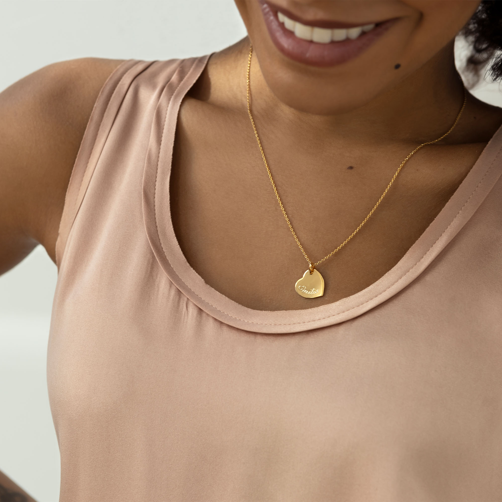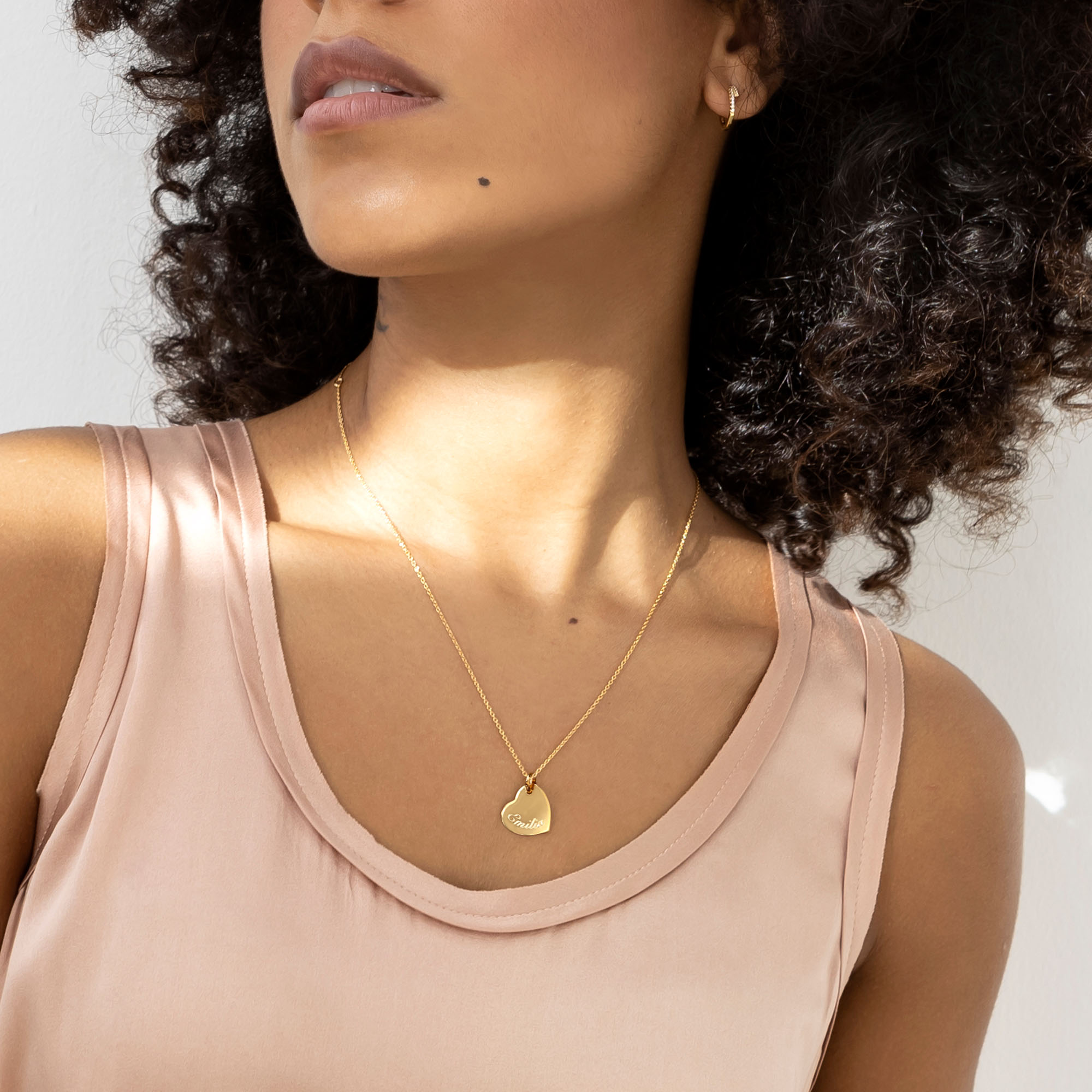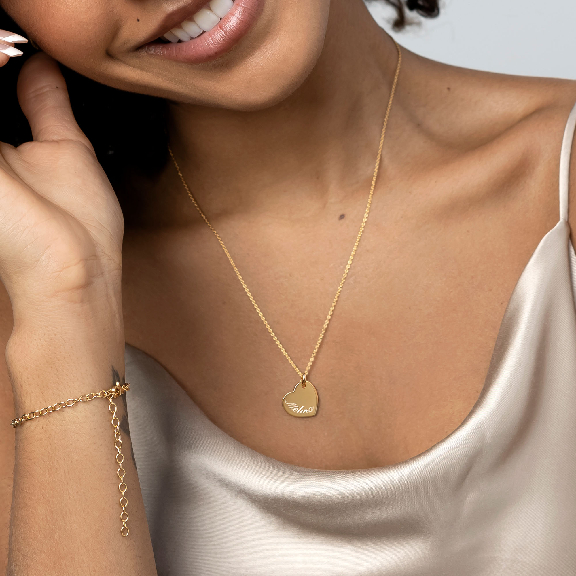 The gold drop heart engraved necklace is suspended from an adjustable 16–18 inch trace chain, with the option to upgrade to a longer 20, 22, or 24 inch adjustable chain to suit your style. Each chain is crafted from sterling silver and plated with 18k gold. The pendant measures 15mm at the widest point by 14mm in height.