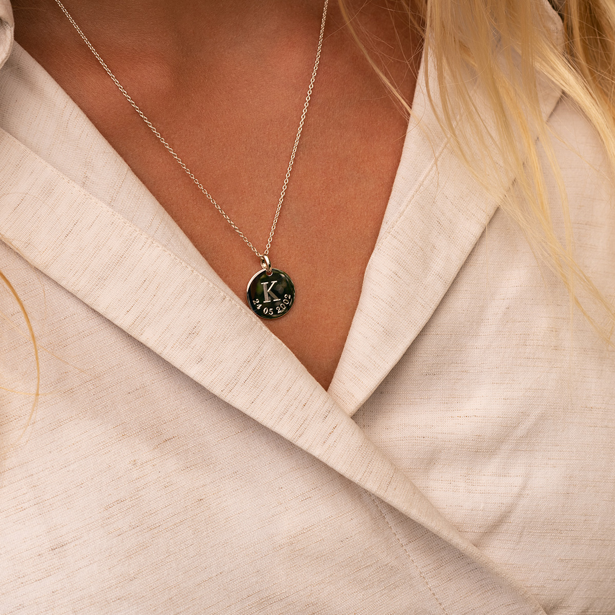Solid silver disc personalised necklace engraved with an initial and date from MYRI London. The unique design layout beautifully and neatly records a significant date, inscribing the day permanently in stunning solid sterling silver. A staple in any jewellery box, the disc personalised necklace delights in its simplicity and is an enduring favourite in the collection. Perfect for layering or for wearing on its own, the silver disc engraved necklace is finished with precision diamond-tipped cutters, creating an impression that will last with lustre for very many years.