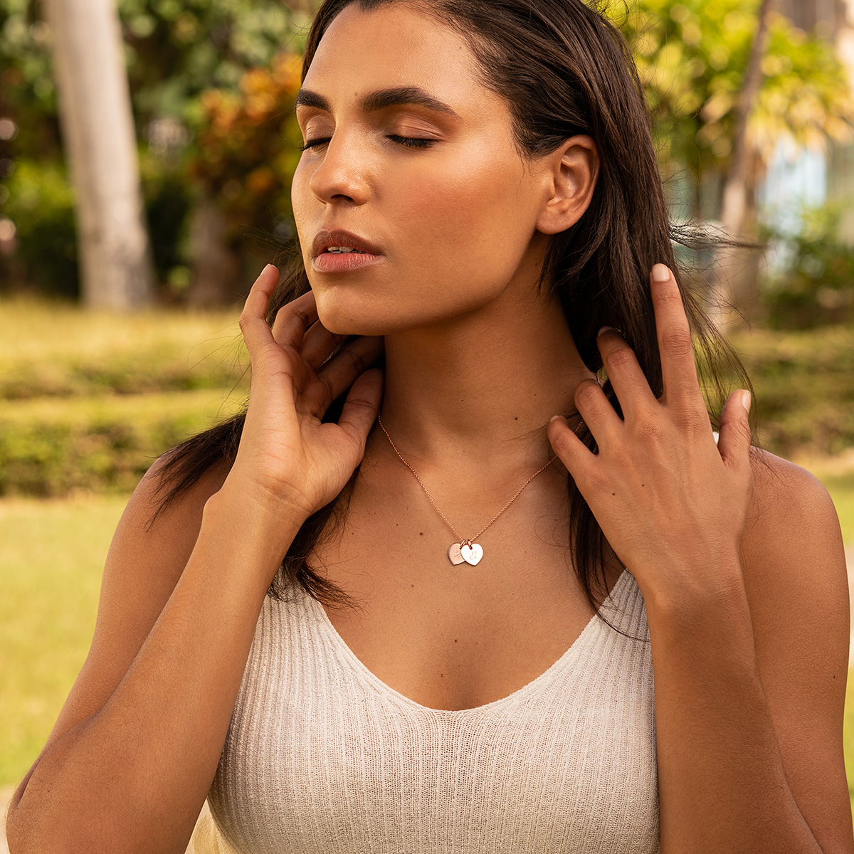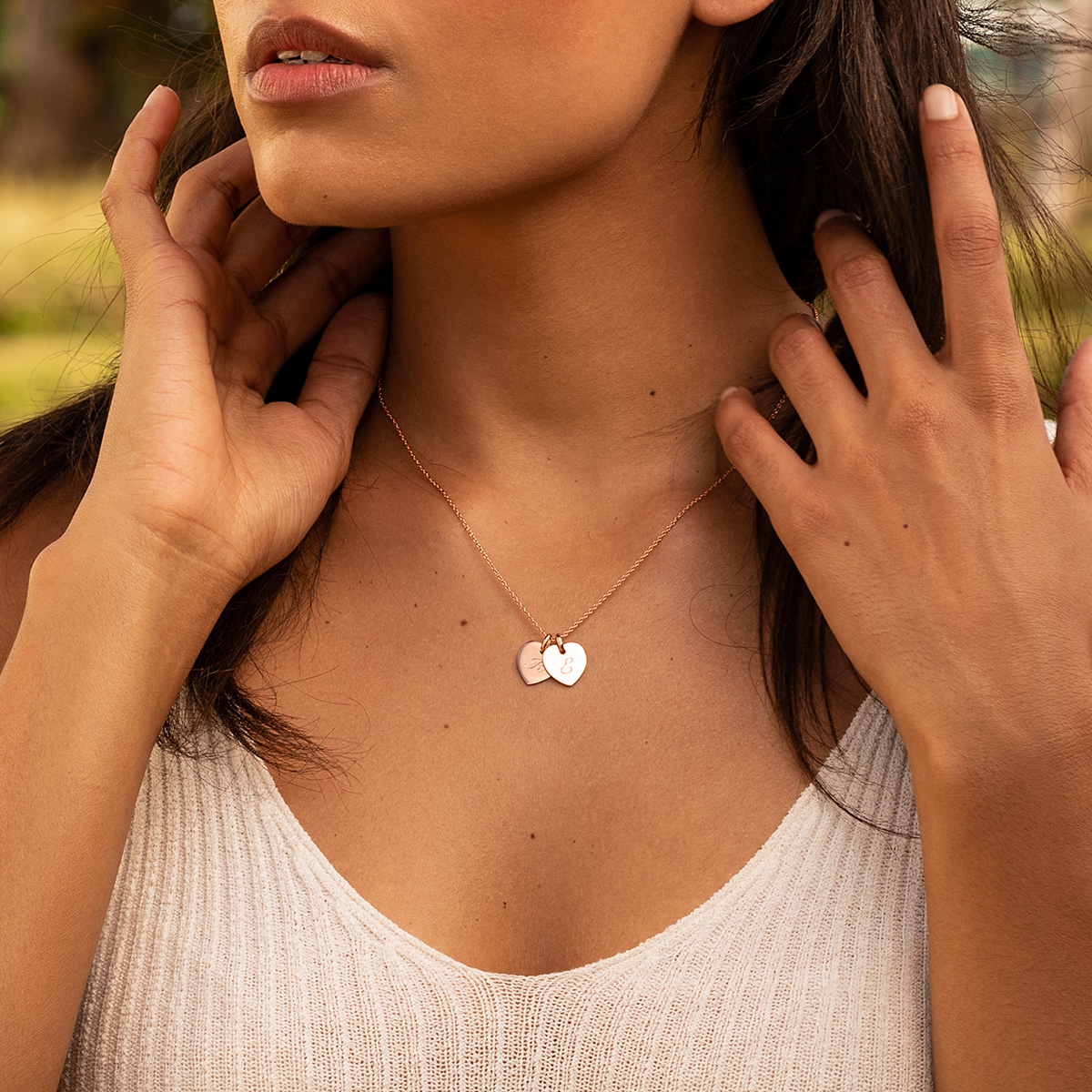Little Twin Heart personalised necklace from MYRI London, engraved with initials in rose gold on solid sterling silver. Two cute and perfectly formed little hearts sit on a rose gold plated chain of solid sterling silver, showcasing two individual initials. Whether the two initials represent two star-crossed lovers, brothers and sisters, sons or daughters or the memories of loved ones, the engraved necklace is a beautiful way to bring together the essence of two people. The personalised necklace is engraved with the finest diamond-tipped cutters, creating an impression that will last forever and a piece of jewellery which will be treasured for very many years to come.