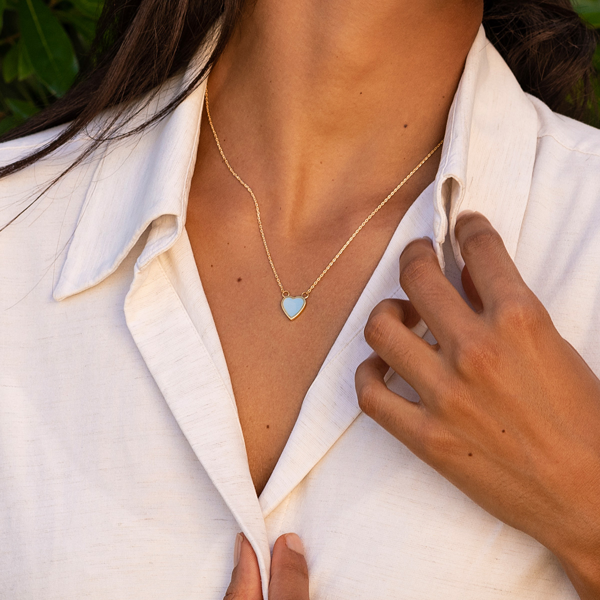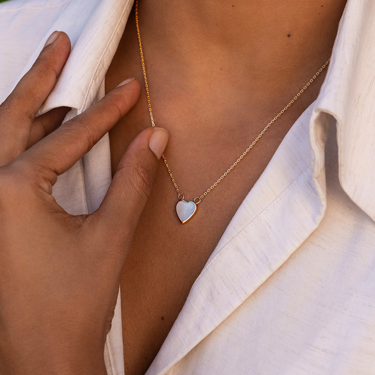 Gold plated sterling silver personalised heart necklace with mother of pearl inlay from MYRI London. This beautiful engraved necklace is of delicate proportions, full of poise and style. A neat gold heart frames a glimmering mother of pearl inlay, showcasing the iridescence of the natural shell. The engraving is made on the reverse of the heart with the finest quality diamond-tipped cutters, creating a brilliant and crisp impression for a special moment.