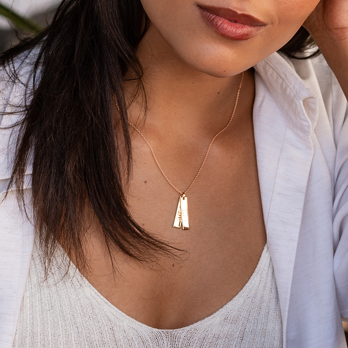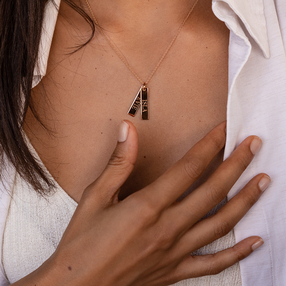 Solid sterling silver engraved twin tag necklace with rose gold from MYRI London. This contemporary piece showcases clean lines and a brilliant finish to put the engraving centre stage. The only item in the Engravers Guild collection that offers a double engraving, the necklace is perfect for inscribing two names that sit side by side.