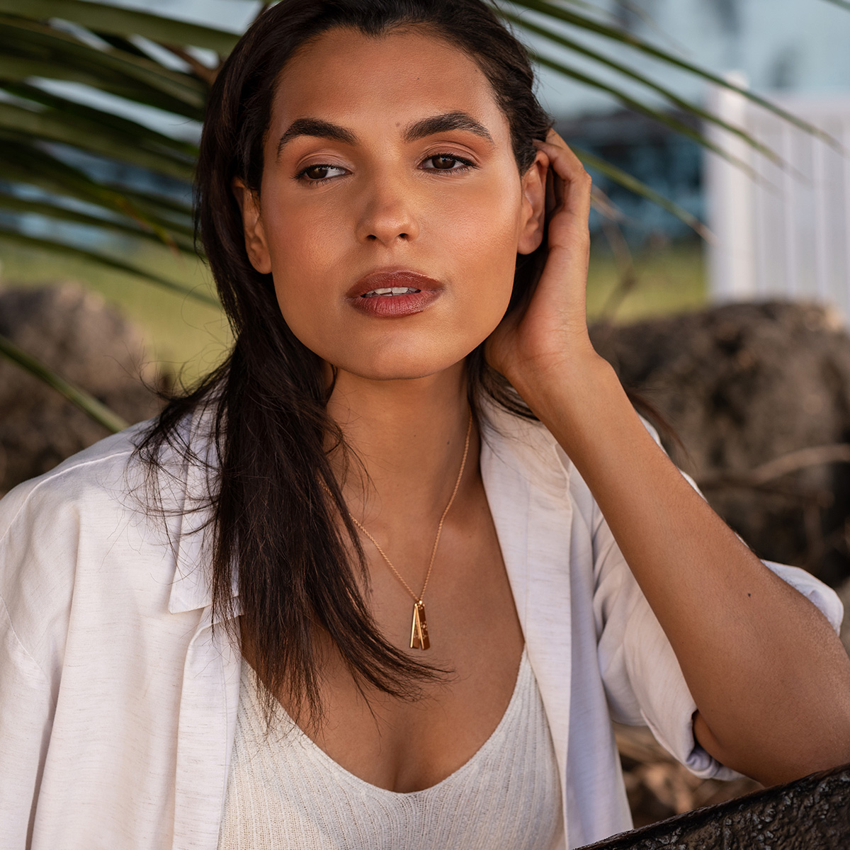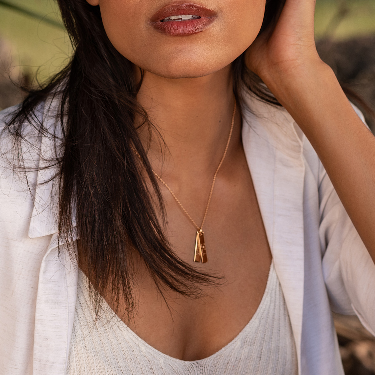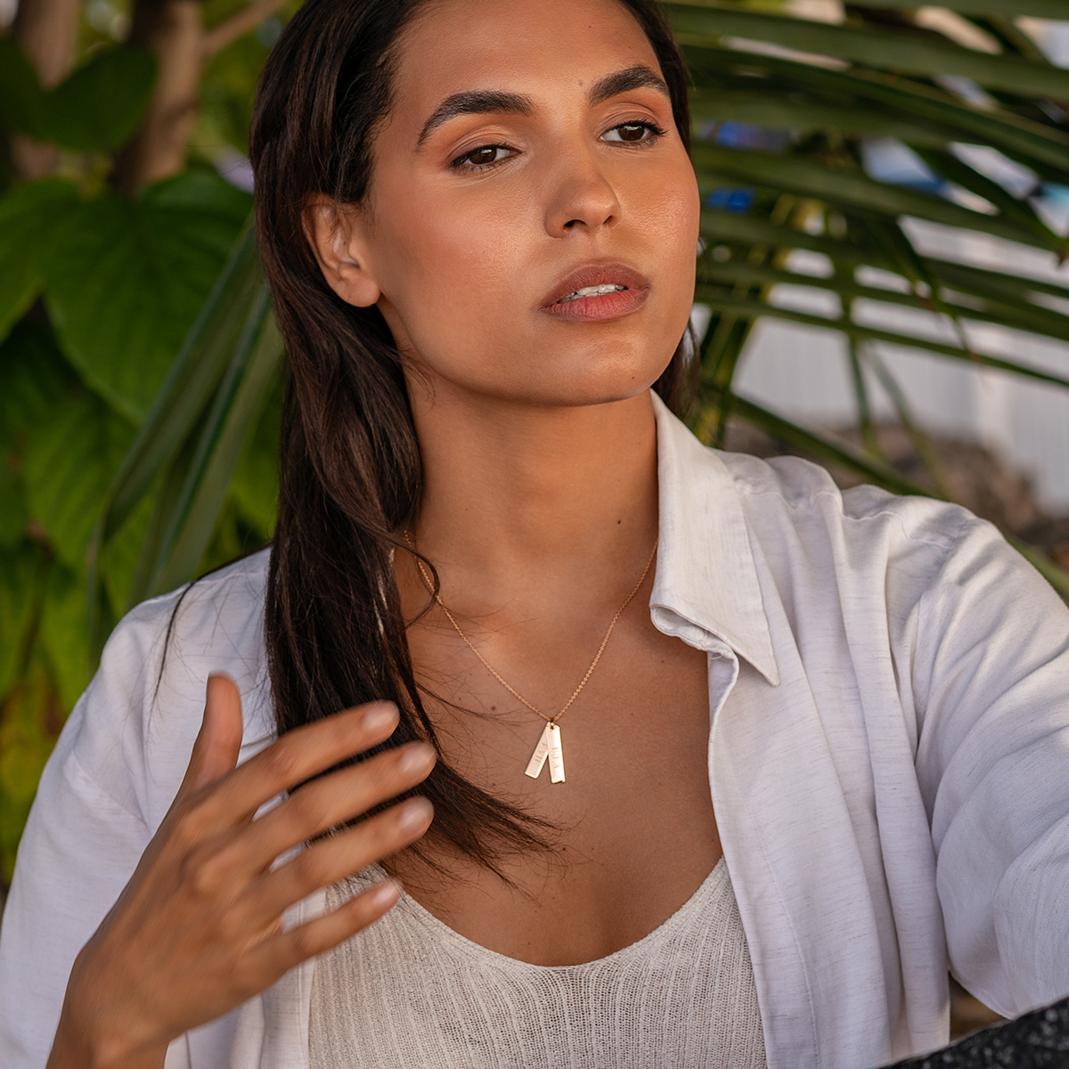 Each tag measures 25mm long by 6mm wide and is suspended from an adjustable 16–18 inch trace chain, with the option to upgrade to a longer 20, 22, or 24 inch adjustable chain to suit your style. Each chain is crafted from sterling silver and plated with 18k gold.
