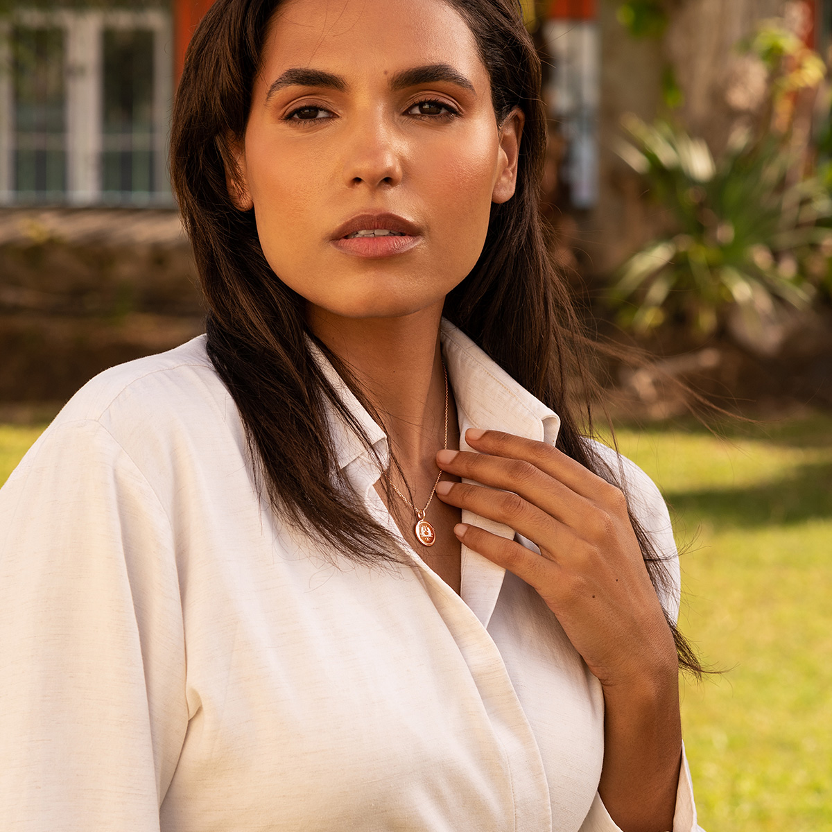 The pendant measures 15mm in diameter and is suspended from an adjustable 16–18 inch trace chain, with the option to upgrade to a longer 20, 22, or 24 inch adjustable chain to suit your style. Each chain is crafted from sterling silver and plated with 18k rose gold.