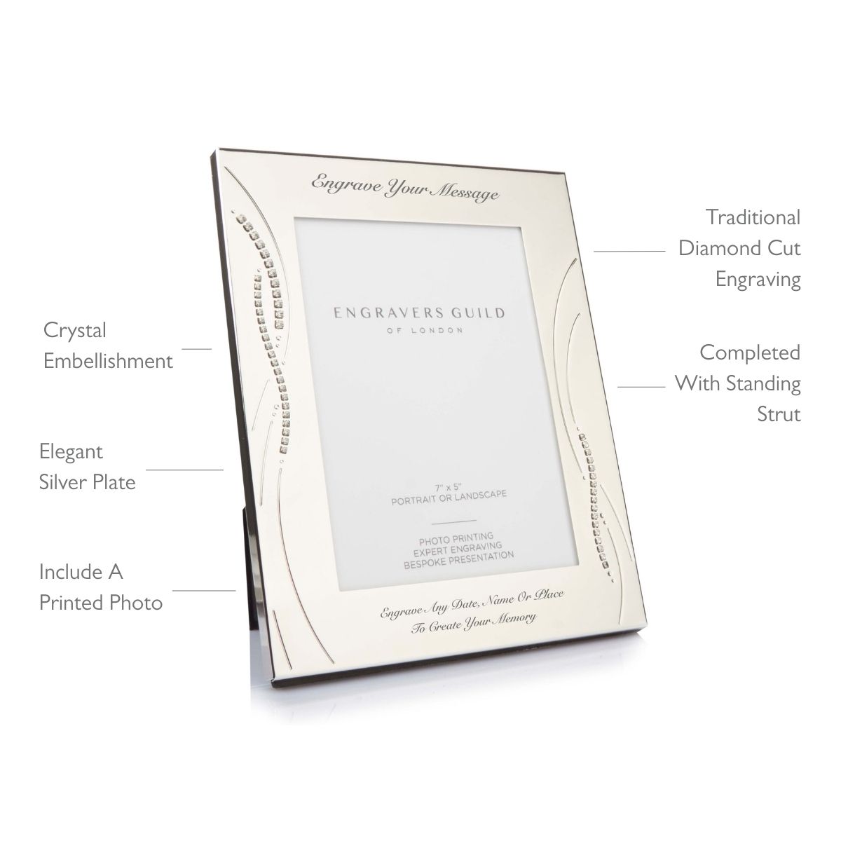 A glamorous silver plated keepsake frame to fit a portrait 5×7 printed photo. This silver plated frame is embellished with a waved crystal design around the photograph insert. Including your chosen printed photo and personalised using precision engraving cuts, this gift is beautifully unique to everyone. This frame is completed with a standing strut.
