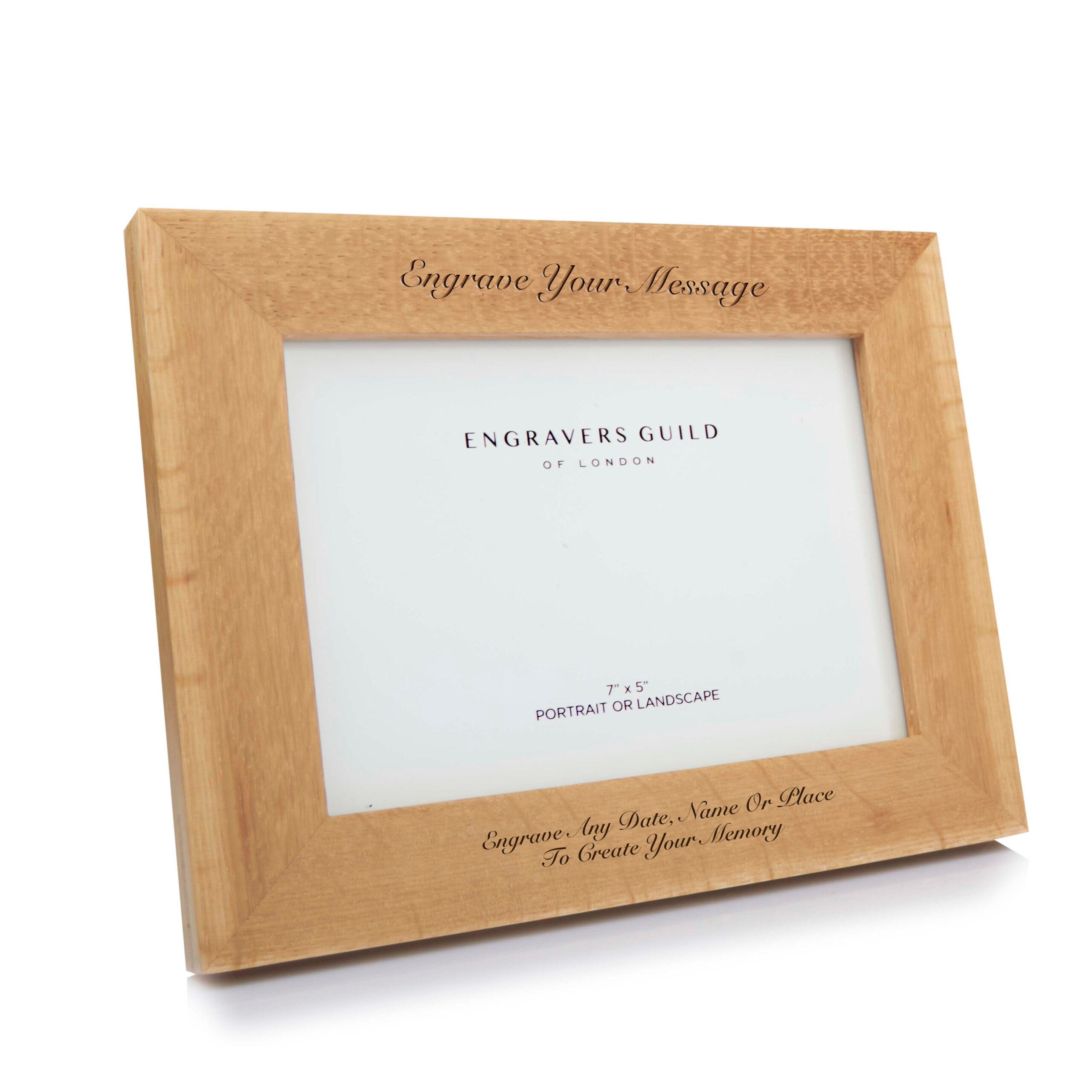 Solid oak photo frame to fit a landscape 5×7 printed photo. Ideal for any home, this frame showcases high quality workmanship with a precision engraved message of your choice along the top and bottom of the frame. Including your chosen printed photo and personalised using precision laser engraving cuts, this gift is beautifully unique to everyone. This frame is completed with a standing strut, wall hanging option and presented in a luxury satin lined gift box.