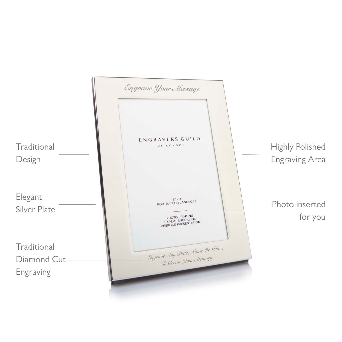 Classic silver plated metal frame, to fit a printed 4×6 photo. Engraved with a message of your choice, this frame is a perfect gift for the modern person and will hold the most precious memories. Complimentary engraving brings a further personal touch, and a selection of signature packaging options creates a very special gift experience.