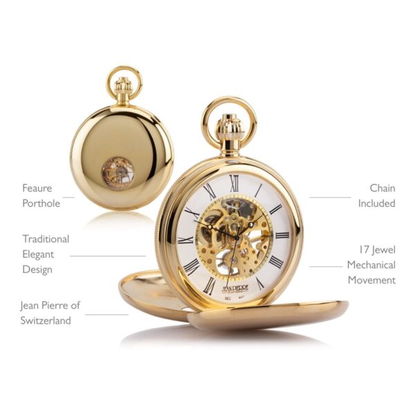 A personalised pocket watch from Jean Pierre stands above all other timepieces. Made in Switzerland to exacting standards, the precision engineered piece exudes beautiful craftsmanship. The skeleton case leaves the full movement on display, showcasing the 17 jewel mechanism.