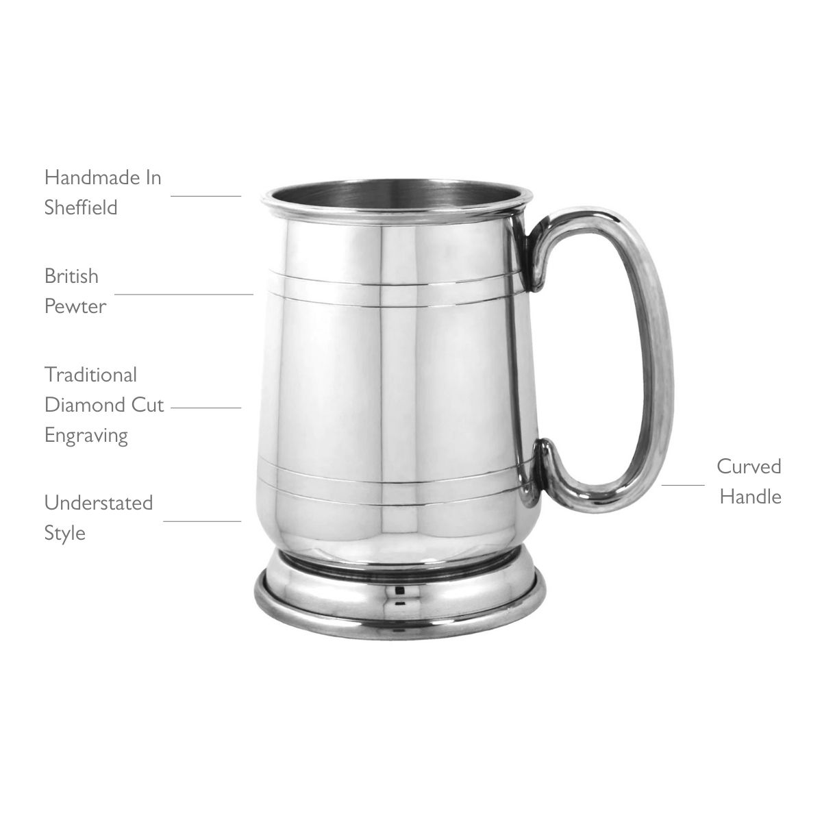 Classic 1 Pint Pewter Tankard, personalised with expert engraving. This timeless piece from the English Pewter Company is made in Sheffield UK and boasts all the character of a British handmade product. This particular one pint tankard also adds understated style to the equation thanks to its straight body which curves at the base and is detailed with simple horizontal line displays and then added to by the simple curved handle.
