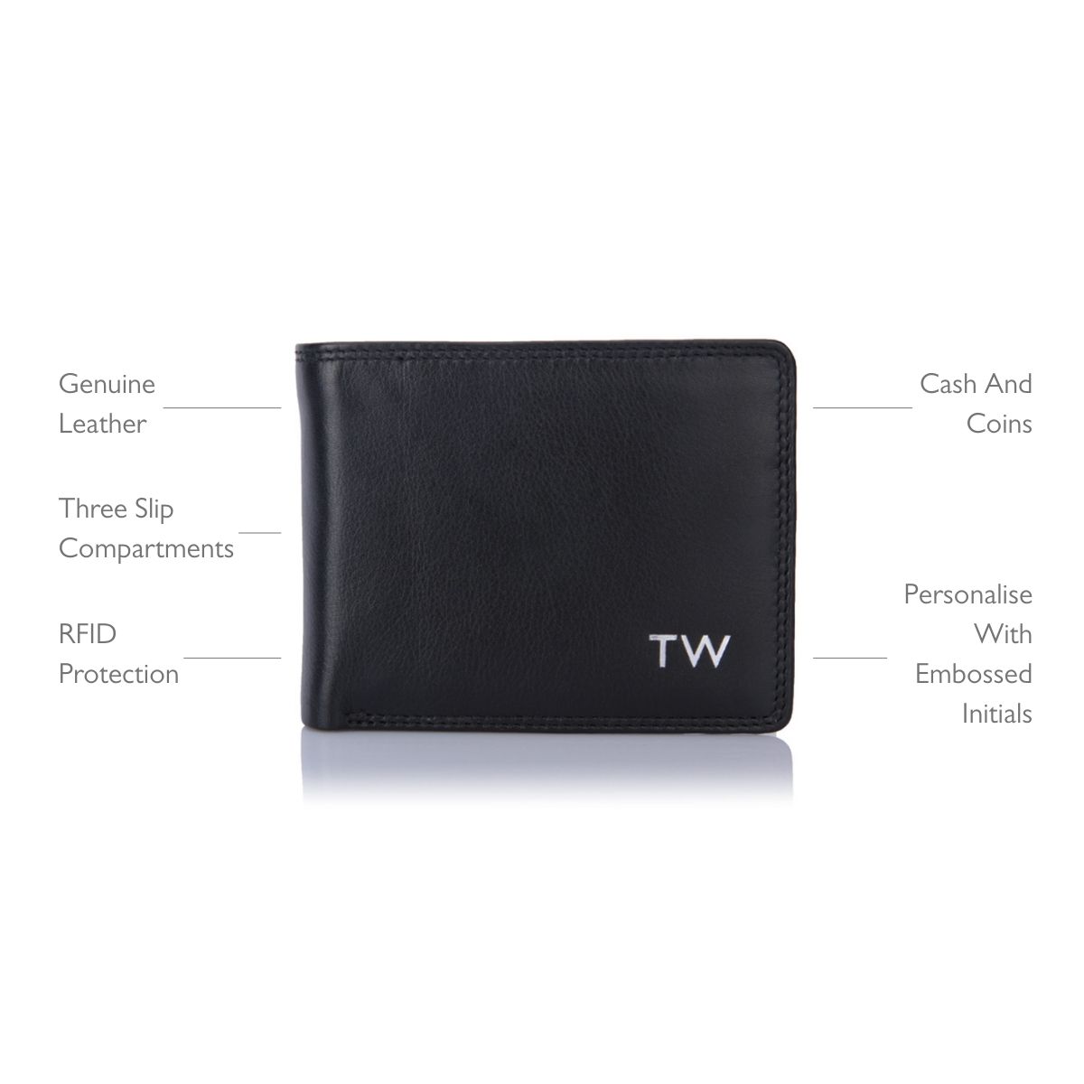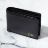 Premium black leather wallet, personalised with gold, silver or blind embossed initials. This custom wallet is one of the best sellers in the collection, designed to carry both cash and coins, as well as also comfortably accommodating four credit cards. Additionally, there are three slip compartments and a slip note compartment for all essentials to be carried neatly. The personalised wallet features RFID protection to keep personal data safe, and a Visconti lining is used throughout.