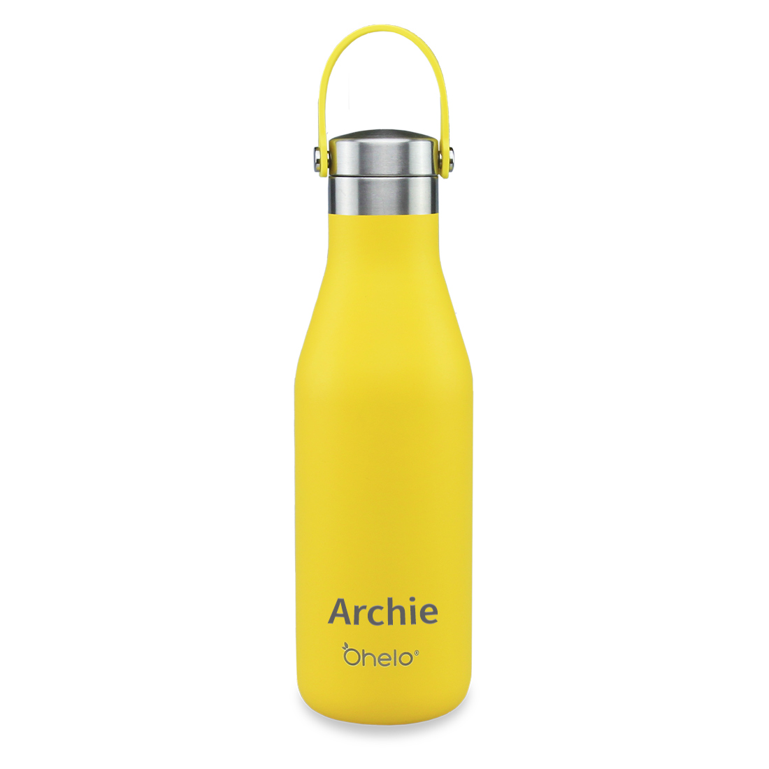 Personalised drinks bottle in the colour Yellow from Ohelo. Ethically produced, this sustainable reusable bottle has double wall insulation, with copper lining to enhance thermal insulation along with a leak proof cap. This bottle also features a powder coat finish providing a chip resistant, slip resistant high end finish and is free from BPA, BPF and BPS. It fits standard ice cubes and keeps contents cold for 24 hours, whilst also keeping warm contents hot for 12 hours.