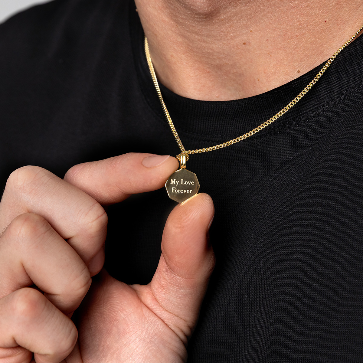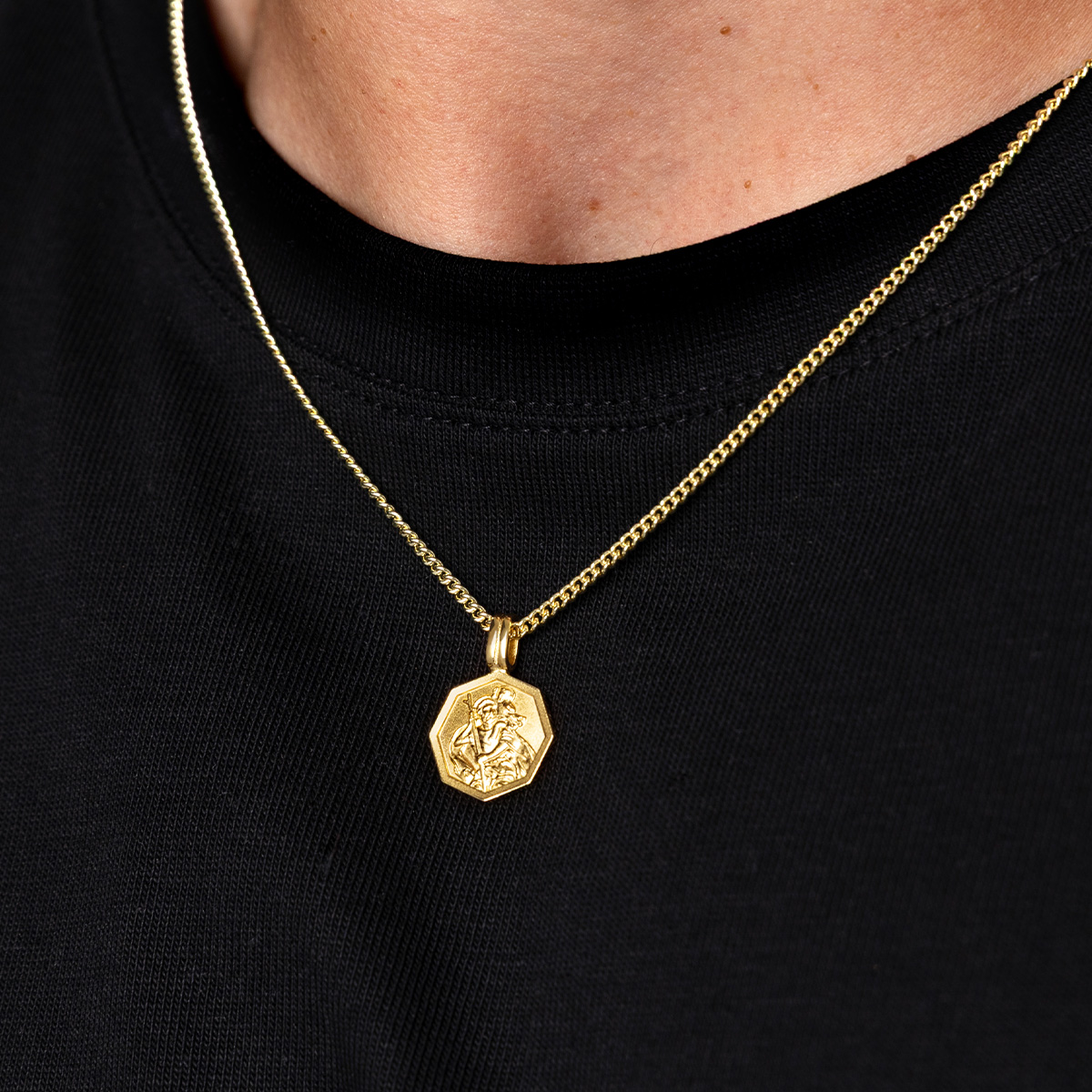 Made from 925 sterling silver with 18k gold plating, this men’s necklace features an octagonal St Christopher pendant with a raised relief of the patron saint of travellers.