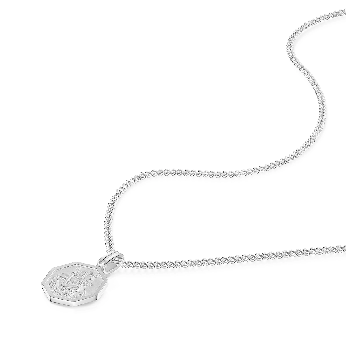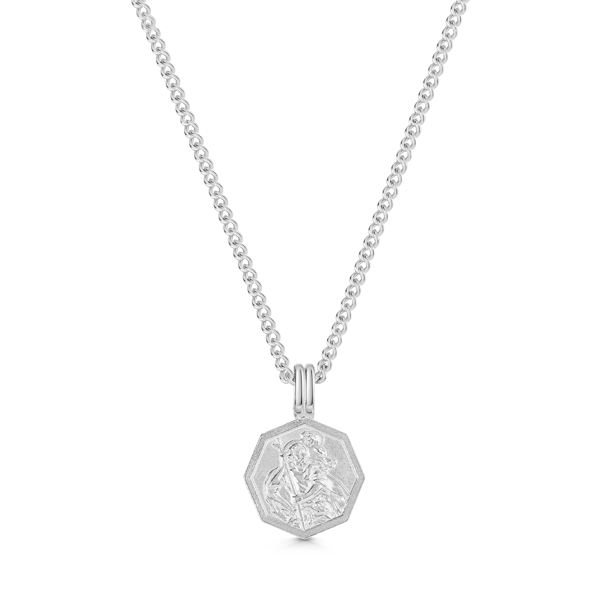 Made from 925 sterling silver, this men’s necklace features an octagonal St Christopher pendant with a raised relief of the patron saint of travellers.