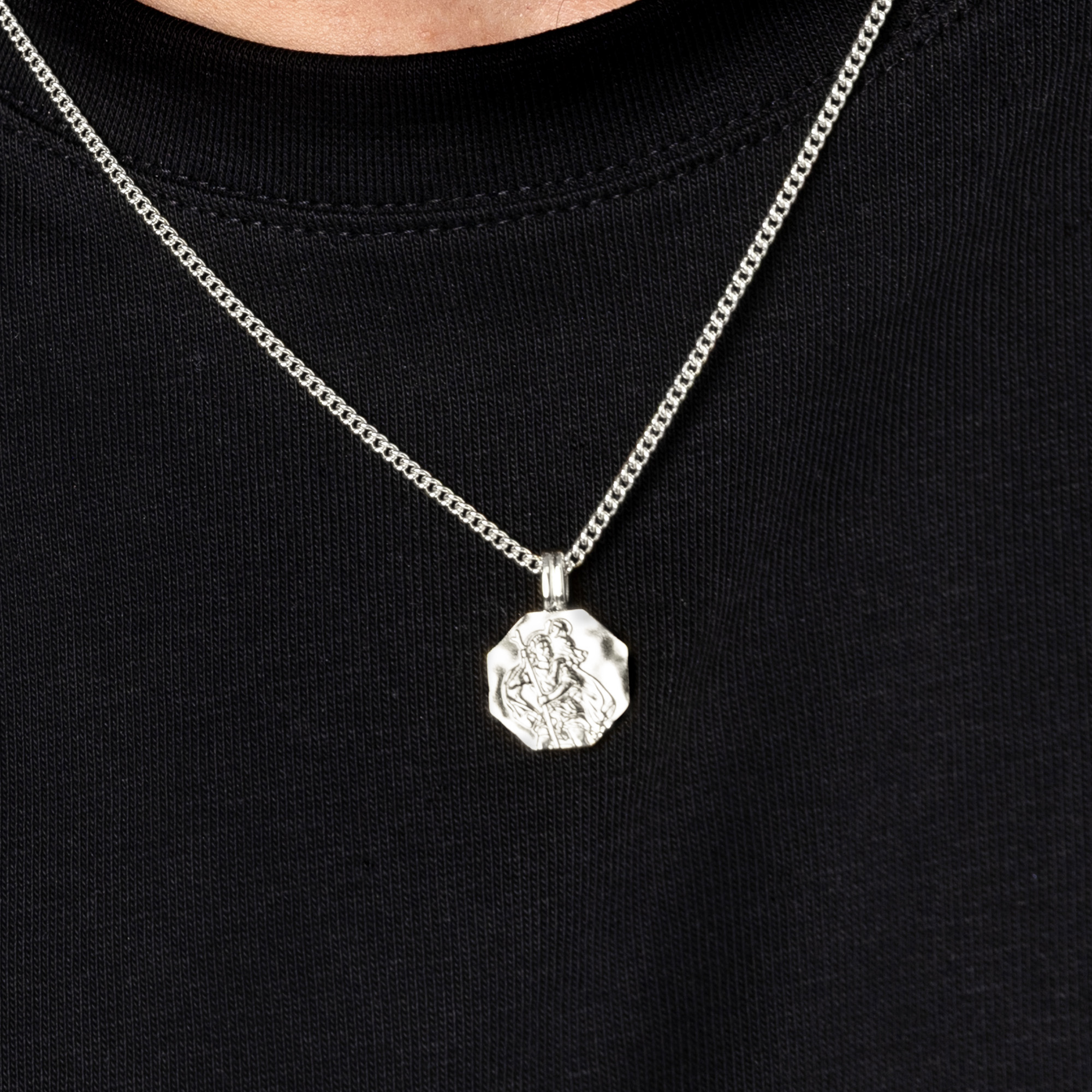 Crafted from 925 sterling silver, this men’s necklace features an octagonal St Christopher pendant with a finely detailed relief of the patron saint of travellers.