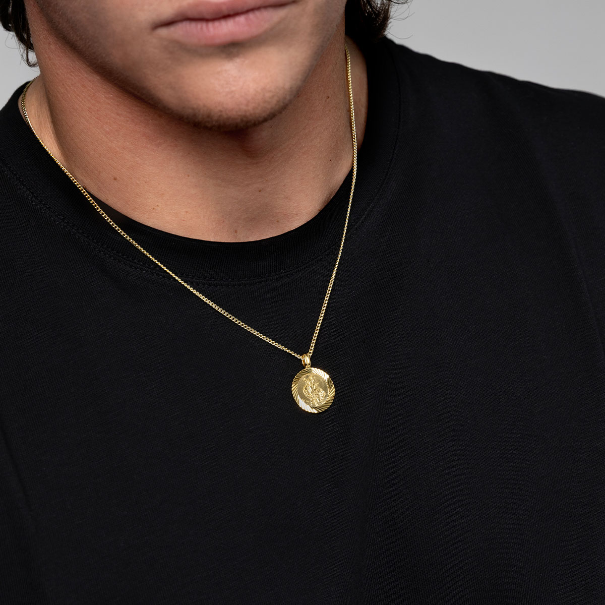 Crafted from 925 sterling silver and plated in 18k gold, this necklace features a round St Christopher pendant with a raised relief design and a distinctive ridged, highly polished border.