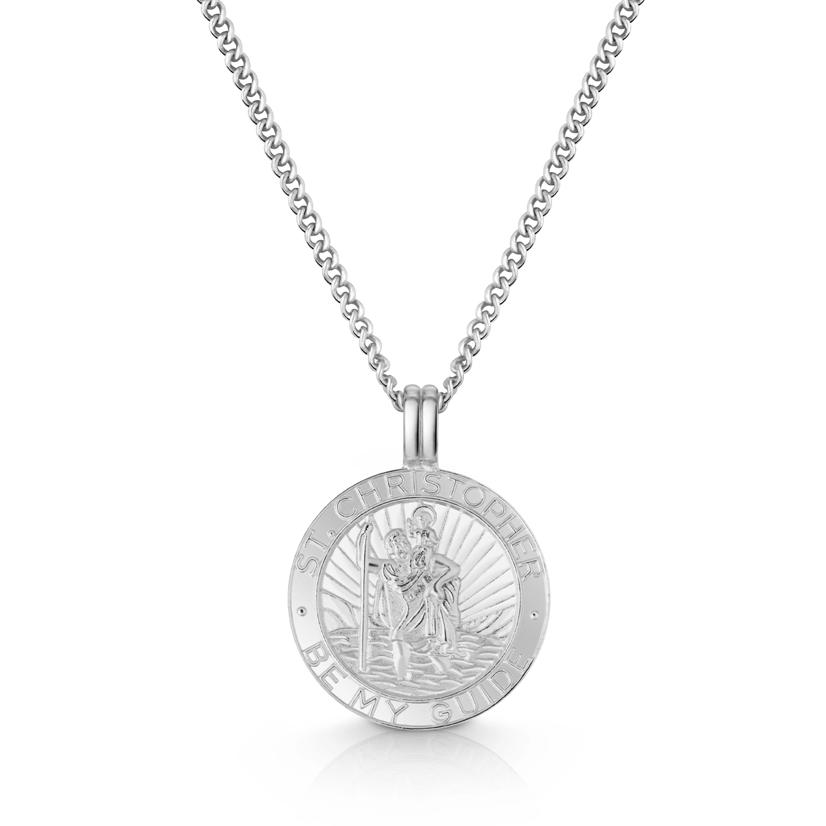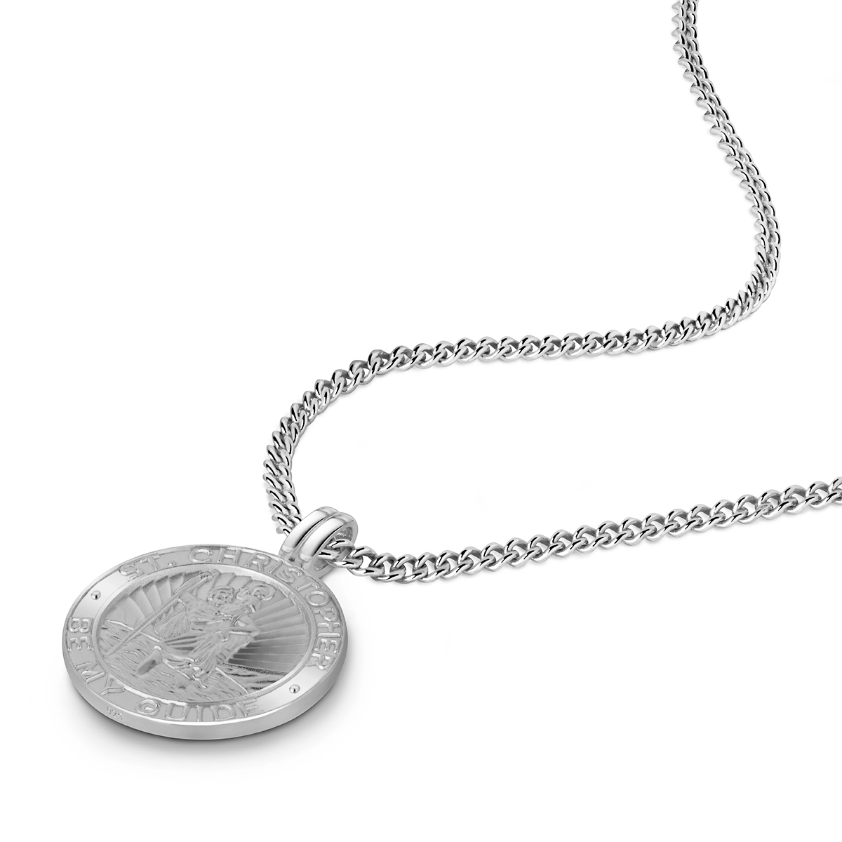Crafted in 925 sterling silver, this men’s necklace features a round St. Christopher pendant engraved with “St. Christopher Be My Guide” – a traditional symbol of protection for travellers.