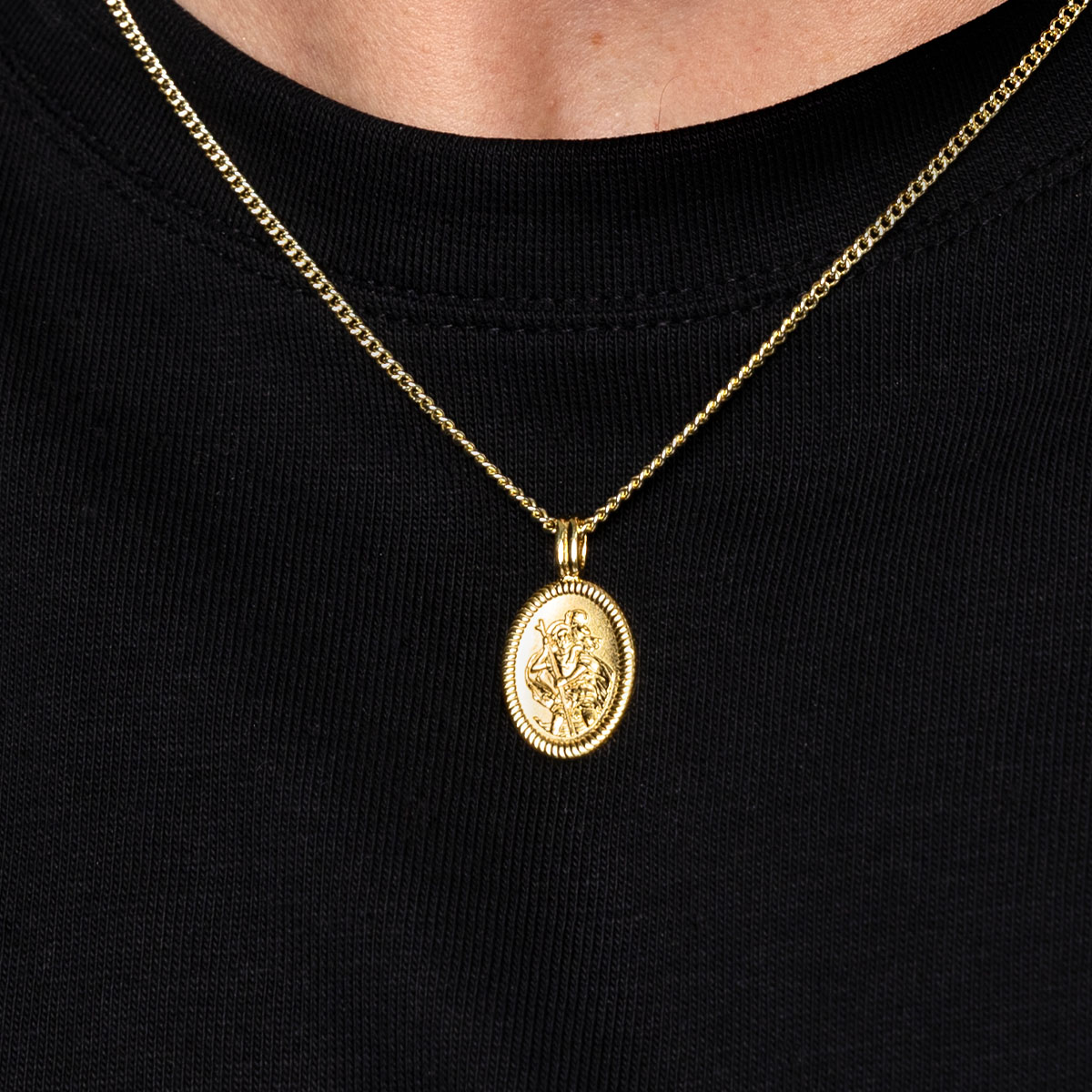 Crafted in 925 sterling silver and plated in 18k gold, this men’s necklace features an oval St Christopher pendant with a raised relief and roped border.