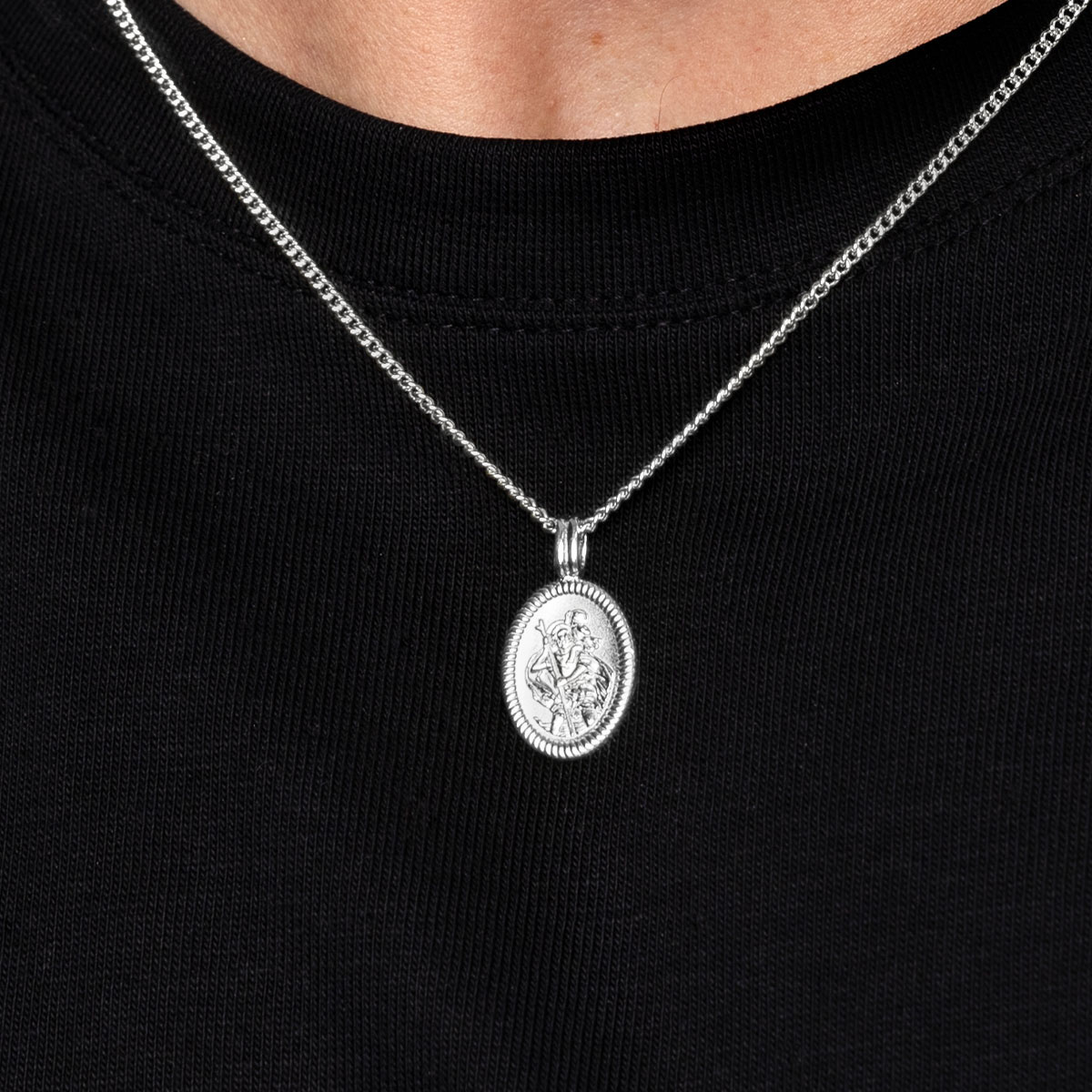 Home > Products > For Him > St Christopher Necklaces > St Christopher Oval Necklace With Roped Edge – Silver